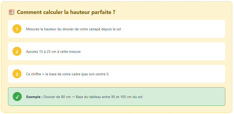 Pour déterminer la position exacte de votre affiche, commencez par mesurer la hauteur de votre dossier de canapé depuis le sol. Ajoutez ensuite vos 15 à 25 cm de marge. Ce chiffre correspond à la base de votre cadre, pas son centre ! Cette technique garantit une cohésion visuelle immédiate dès que vous entrez dans la pièce.