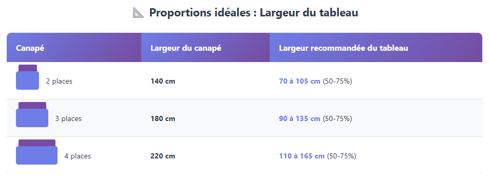 | Largeur du canapé | Largeur recommandée pour le tableau |