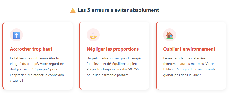 L’erreur la plus fréquente consiste à placer le tableau beaucoup trop haut sur le mur. Cette disposition rompt le lien visuel avec le canapé et crée une sensation de vide inconfortable. Votre regard ne doit jamais avoir à “grimper” pour apprécier l’affiche. La décoration murale doit s’intégrer naturellement dans votre champ de vision lorsque vous êtes assis ou debout dans la pièce.