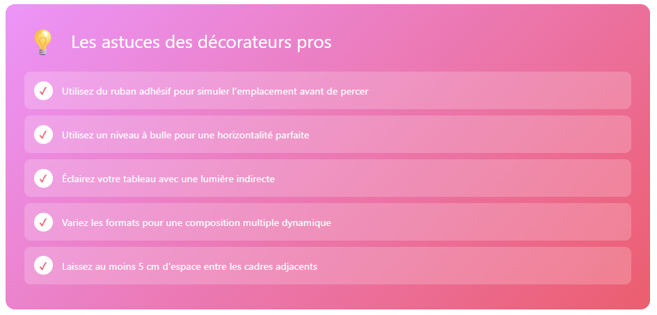 Avant de percer définitivement vos murs, utilisez du ruban adhésif de masquage pour simuler l’emplacement de votre affiche. Cette technique simple vous permet de visualiser le résultat final et d’ajuster si nécessaire. Prenez le temps d’observer depuis différents angles de la pièce : assis sur le canapé, depuis l’entrée, ou depuis les autres sièges. Cette vérification multiple garantit un résultat satisfaisant de tous les points de vue !