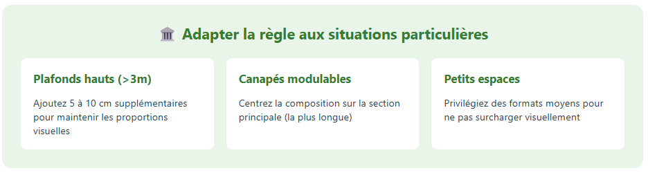 Dans les pièces avec des plafonds de plus de 3 mètres, vous pouvez augmenter légèrement la distance entre le canapé et le tableau. Ajoutez 5 à 10 cm supplémentaires pour compenser la hauteur sous plafond et maintenir les proportions visuelles. Cette adaptation préserve l’équilibre malgré les volumes généreux de la pièce.