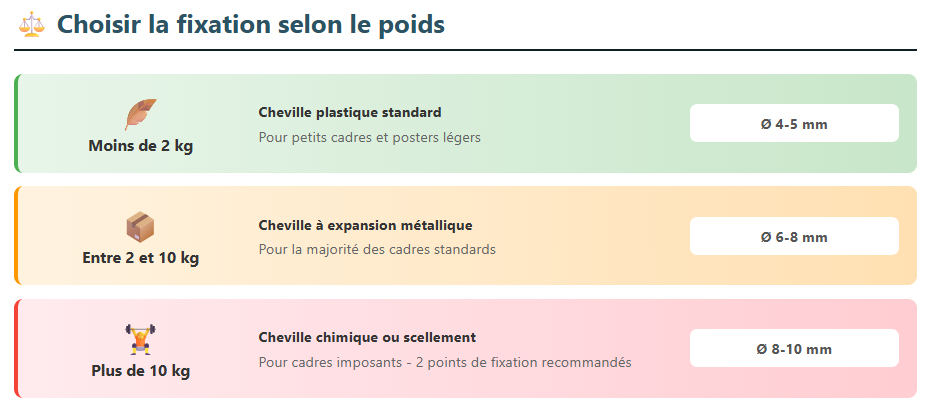 Tous les cadres ne se valent pas en termes de poids. Un petit poster sous verre léger ne nécessite pas la même fixation qu’une grande toile encadrée avec un cadre massif en bois. Voici un tableau récapitulatif pour vous guider dans votre choix :