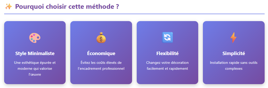Cette approche présente également un aspect pratique non négligeable. Le coût d’un encadrement peut rapidement grimper, surtout si vous souhaitez un rendu de qualité. En optant pour une suspension sans cadre, vous réalisez des économies tout en conservant un résultat visuellement impactant. De plus, vous gagnez en flexibilité : changer votre décoration devient plus simple et moins onéreux !