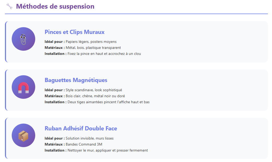 Le choix du système de fixation dépend directement des caractéristiques de votre affiche. Voici un aperçu des différentes options selon vos besoins :
