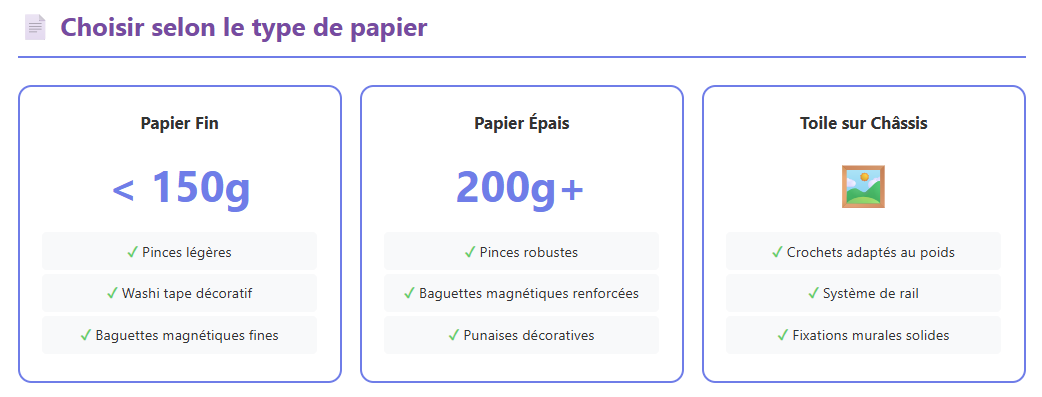 - Papier fin (moins de 150g) : privilégiez les pinces légères, le washi tape décoratif ou les baguettes magnétiques fines