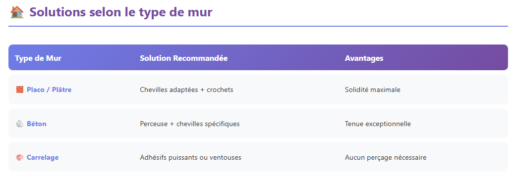 | Placo / Plâtre | Chevilles adaptées + crochets | Solidité maximale |