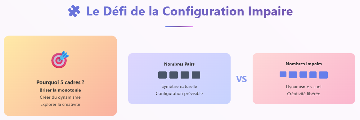 L’art de la composition murale avec cinq éléments permet de jouer sur les contrastes et les équilibres visuels. Contrairement aux nombres pairs qui appellent naturellement la symétrie, le chiffre cinq vous invite à explorer des configurations plus dynamiques et créatives. Cette approche transforme votre mur en véritable galerie personnalisée !