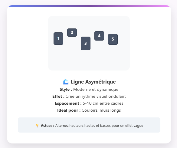 Cette technique consiste à aligner vos cinq cadres horizontalement en jouant sur les hauteurs variables. Vous pouvez créer un effet de vague en alternant cadres hauts et bas, ou opter pour une progression croissante ou décroissante. L’astuce réside dans le maintien d’un espacement régulier entre chaque élément, généralement entre 5 et 10 centimètres selon la taille de votre mur.