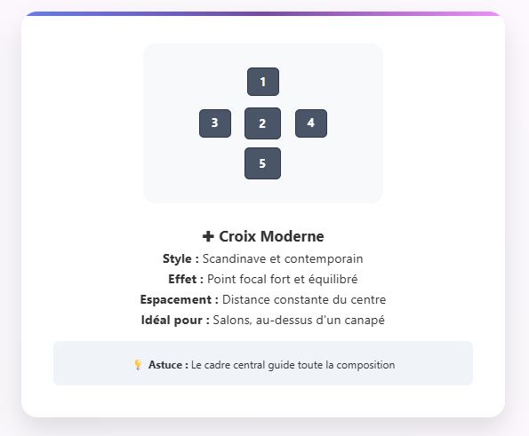 Placez un cadre central au centre de votre composition, puis disposez les quatre autres aux points cardinaux : un en haut, un en bas, un à gauche et un à droite. Cette configuration s’inspire des principes du design scandinave et apporte une touche contemporaine à votre intérieur. La distance entre le cadre central et les autres doit rester constante pour préserver l’harmonie visuelle.