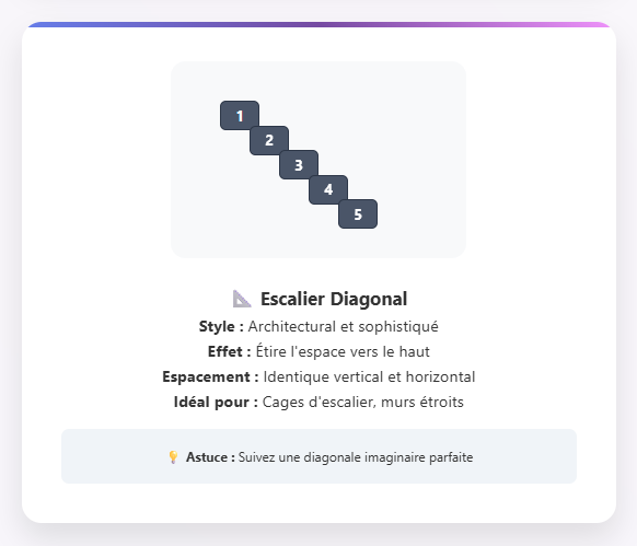 Suivez la diagonale imaginaire de votre mur en créant un effet d’escalier avec vos cinq cadres. Cette disposition fonctionne particulièrement bien le long d’un escalier ou sur un mur étroit. L’espacement vertical et horizontal doit être identique pour maintenir la cohérence de l’ensemble.