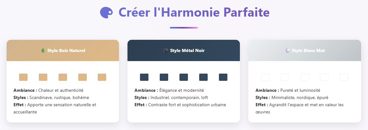 Le choix des cadres influence considérablement le rendu final. Des cadres identiques créent une unité forte, tandis que des styles variés apportent de la personnalité. Vous pouvez jouer sur les matériaux : bois clair, métal noir, ou encore cadres blancs pour un style épuré. L’important est de conserver un fil conducteur, comme une même couleur ou un matériau récurrent.