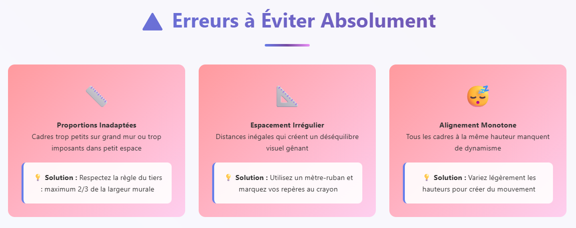 Évitez également de placer tous vos cadres à la même hauteur si vous optez pour une disposition linéaire. Cette configuration peut paraître monotone et manquer de dynamisme. Variez légèrement les hauteurs pour créer du mouvement visuel.