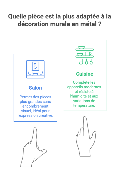 La cuisine représente également un excellent choix pour intégrer des éléments métalliques muraux. En effet, ce matériau s’harmonise parfaitement avec les équipements électroménagers et les plans de travail contemporains. L’aspect pratique n’est pas négligeable : le métal résiste remarquablement bien à l’humidité et aux variations de température caractéristiques de cette pièce.
