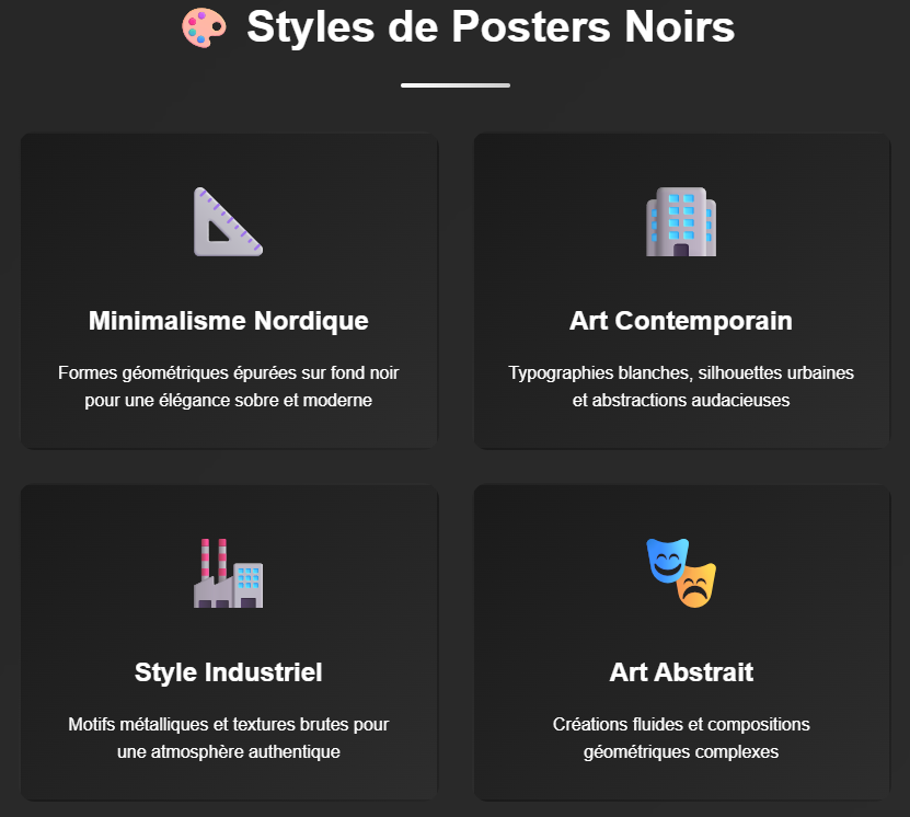 L’avantage principal du noir réside dans sa capacité à structurer l’espace visuel. Une affiche noire bien positionnée devient instantanément un point focal qui attire le regard et organise la perception de la pièce. Cette dynamique s’applique parfaitement au domaine de la décoration murale, où chaque élément doit contribuer à l’harmonie générale.