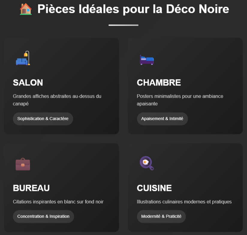Chaque pièce de votre habitation peut accueillir une déco murale noire adaptée à sa fonction et à son ambiance. Le salon constitue l’espace idéal pour exposer des compositions de grande taille qui impressionnent vos invités. Au-dessus du canapé ou face à l’entrée, une affiche noire crée immédiatement une impression de sophistication.