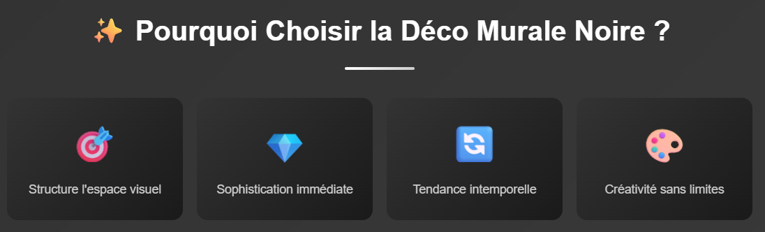 D’année en année, les tendances de décoration évoluent, mais le noir conserve sa position d’incontournable dans l’univers du design intérieur. Investir dans une décoration murale de qualité représente un choix durable qui traverse les modes. Enfin, n’oubliez pas que votre intérieur doit avant tout refléter votre personnalité et vos goûts personnels !