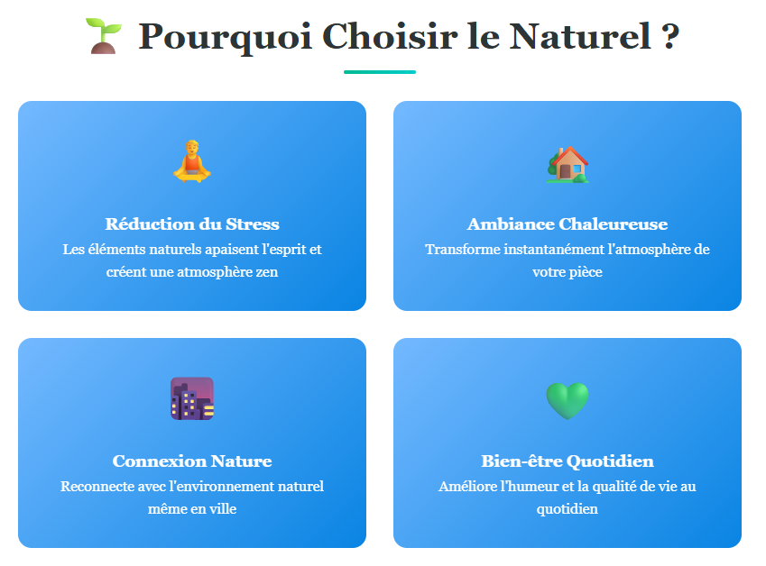 Cette tendance répond parfaitement aux besoins actuels de bien-être et de sérénité dans nos foyers. En effet, les études montrent que la présence d’éléments naturels dans notre environnement quotidien contribue à réduire le stress et améliorer notre humeur. D’ailleurs, intégrer des éléments végétaux sur vos murs représente une solution accessible et efficace pour bénéficier de ces bienfaits sans nécessiter d’entretien particulier.