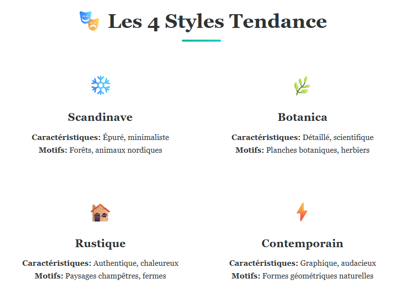 | Scandinave | Épuré, minimaliste | Forêts, animaux nordiques |