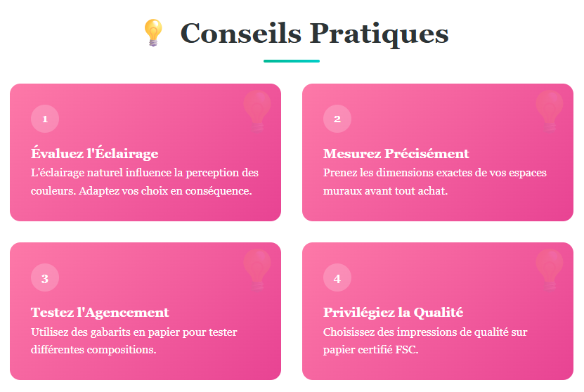 - Mesurez précisément vos espaces muraux avant de choisir les formats