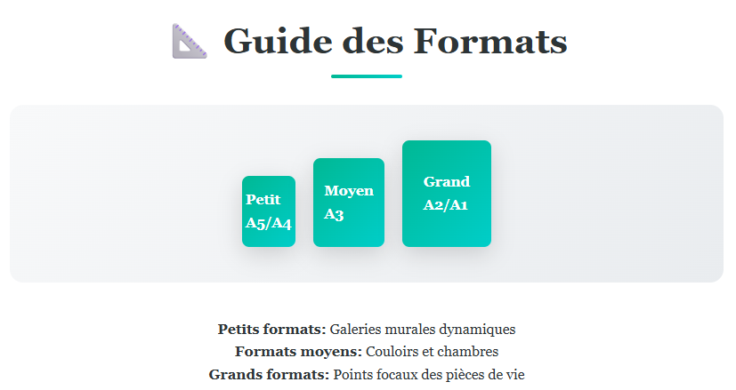 Les dimensions des affiches déterminent largement l’impact visuel de votre décoration murale naturelle. Les grands formats conviennent parfaitement aux murs principaux des pièces de vie, créant de véritables points focaux. Les formats moyens s’adaptent aux espaces intermédiaires comme les couloirs ou les chambres. Enfin, les petits formats permettent de créer des galeries murales dynamiques et personnalisées. Cette variété de tailles offre une flexibilité créative remarquable pour s’adapter à tous les espaces !