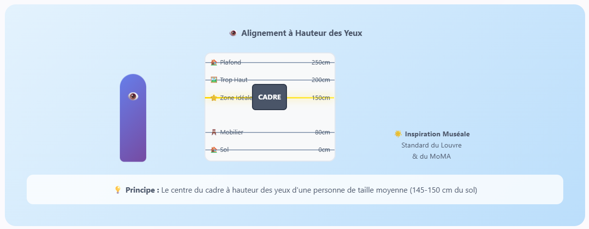 La règle universelle recommande de positionner le centre de votre cadre à environ 145-150 centimètres du sol. Cette mesure correspond approximativement à la hauteur des yeux d’une personne de taille moyenne. D’ailleurs, cette technique s’inspire directement des standards utilisés dans les galeries d’art et musées du monde entier, comme le Louvre ou le MoMA.